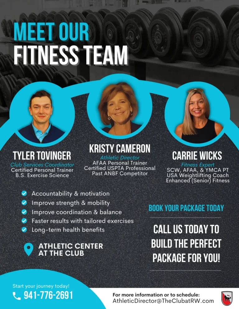 Members have access to unlimited use of the athletic and fitness center, tennis and pickleball courts, and fitness classes. Our certified personal trainers offer sessions tailored to your goals and needs, as well as specialized 1:1 sessions like our Assisted Stretch and SwingFlex Performance Training.